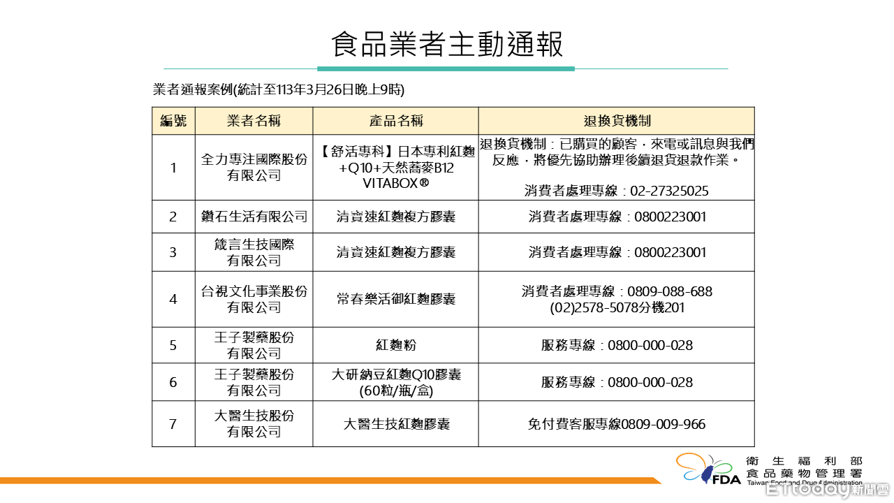 ▲台灣7家業者提供消費者處理專線。(圖/食藥署提供,下同)※點圖放大