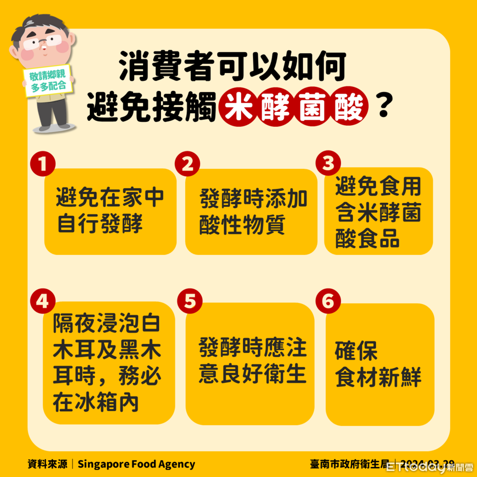 另,新加坡食品局(Singapore Food Agency)網站提供了六點重要自保措施,以防範罕見米酵菌酸的危害:第一、發酵過程需要嚴格之衛生條件,盡量避免在家中自行發酵玉米、椰奶或果肉等產品。第二、想發酵玉米或椰子等產品,可以添加檸檬汁、醋或乳酸等酸性物質,確保混合物呈酸性。第三、未確定來源及安全性時,避免食用。第四、要隔夜浸泡白木耳或黑木耳,確保浸泡過程在冰箱內進行。第五、處理食品應採取良好之衛生措施,例如對食品接觸之表面進行消毒。第六、永遠確保食品的新鮮。不因惜福而捨不得丟棄,惜福的舊觀念,恐讓人珍惜的不是福氣,而是孳生各種致病源。(資料來源:https://www.sfa.gov.sg)