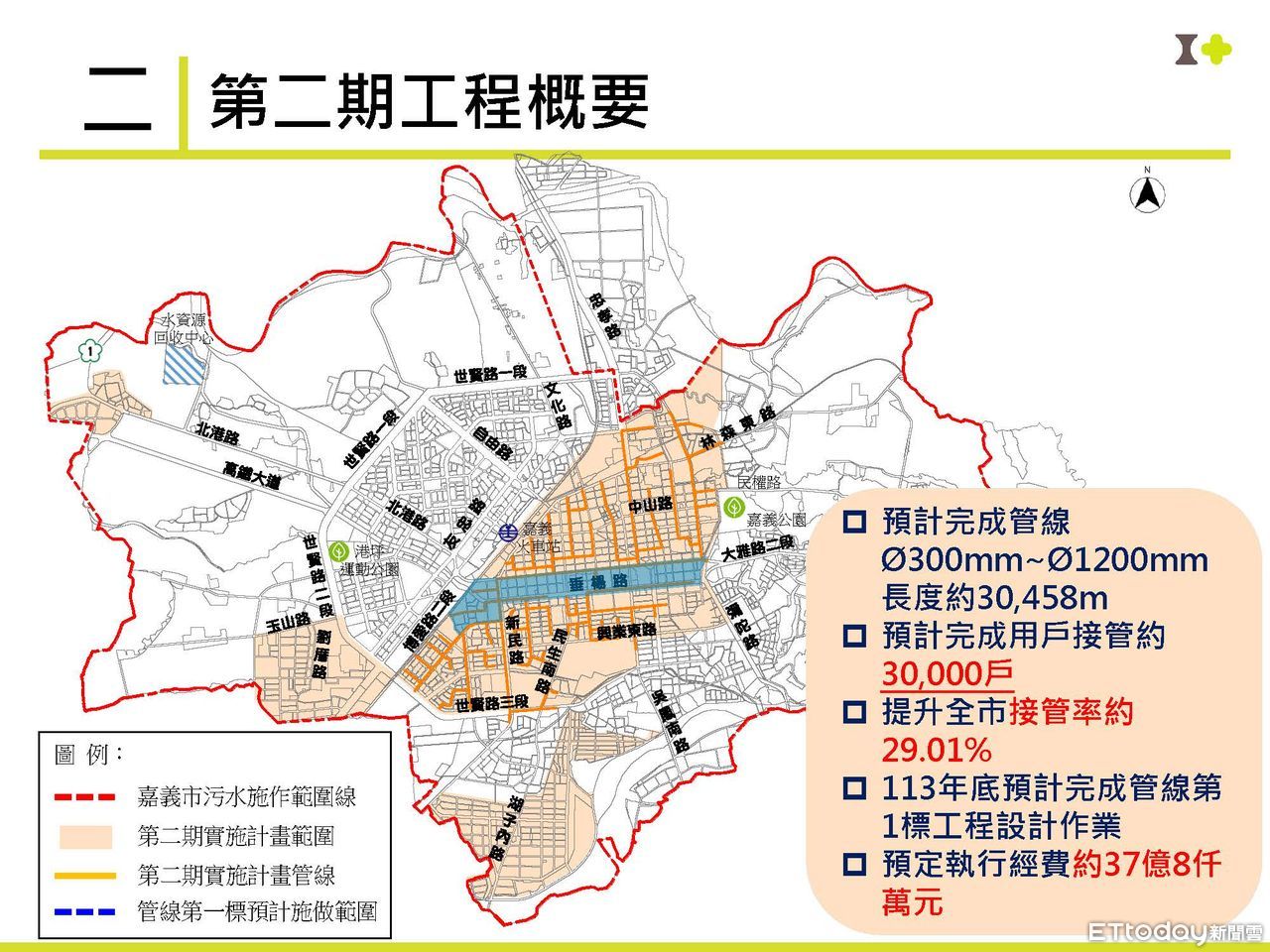工務處表示,「嘉義市污水下水道系統第二期工程設計及監造」工作由「聯聖工程顧問股份有限公司」得標,計畫總工程費約新臺幣37億8仟萬元,實施期程為114年至119年,規劃範圍主要為鐵路以東、嘉義高商以西、北門火車站以南、嘉義大學新民校區以北以及劉厝、竹仔腳、湖仔內等嘉義市重要區域, 採分階段設計,分年分標興建之方式辦理,內容涵蓋污水下水道分支管網、用戶接管及嘉義市水資源回收中心第二期擴建工程等,後續將全力推動執行,讓嘉義市朝現代化城市更邁進一大步。