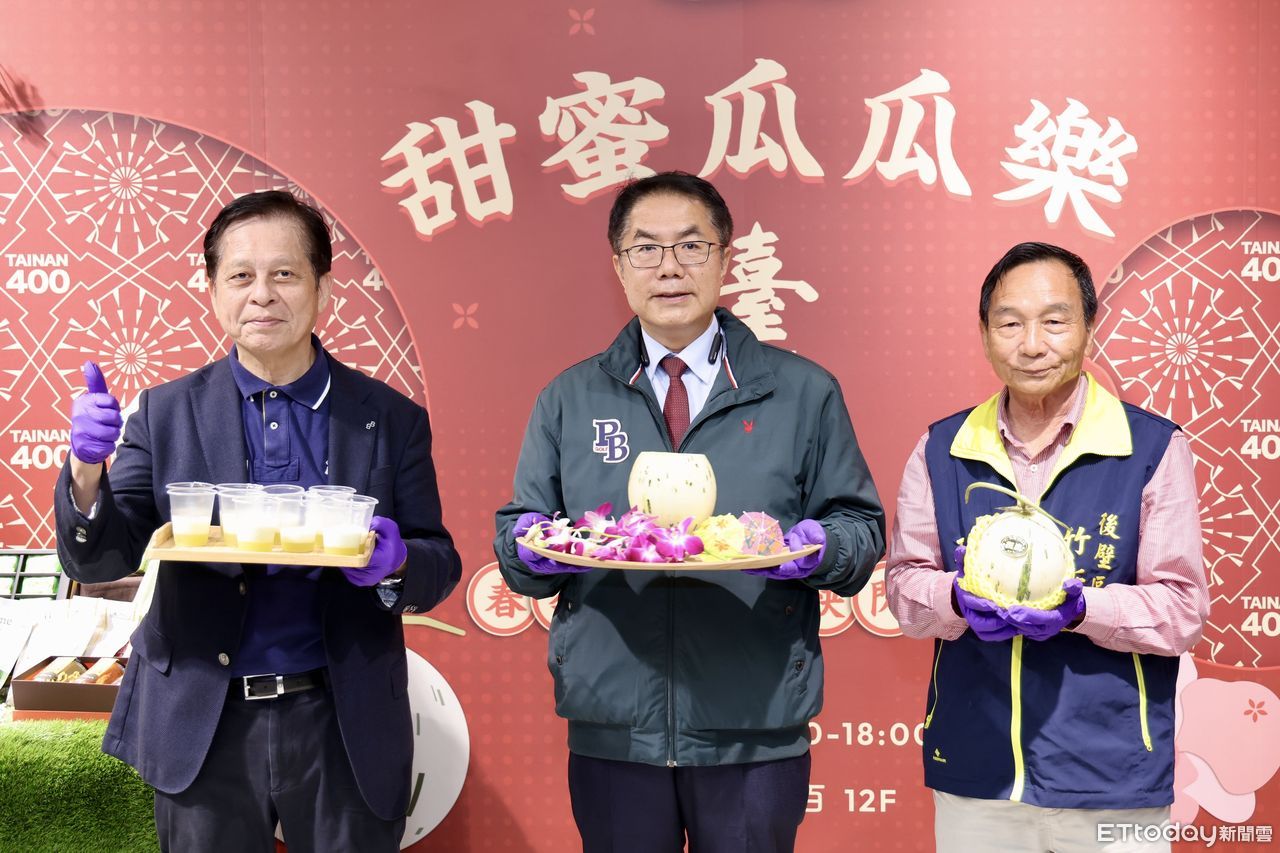 今年適逢台南400,不負全糖城市之名,台南全年香甜果品由春季洋香瓜打頭陣,繼去年秋季洋香瓜在板橋和竹北銷售創下佳績,台南市長黃偉哲30日特地帶新鮮春季洋香瓜北上台中大遠百與民眾分享,並現場示範製作洋香瓜冰沙,搭配蝴蝶蘭裝飾顯得秀色可餐,民眾爭相拍照紀念。