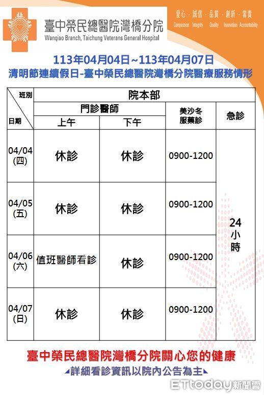 ▲臺中榮總嘉義暨灣橋分院113年兒童節及民族掃墓節門診時段調整 。(圖/記者翁伊森翻攝)