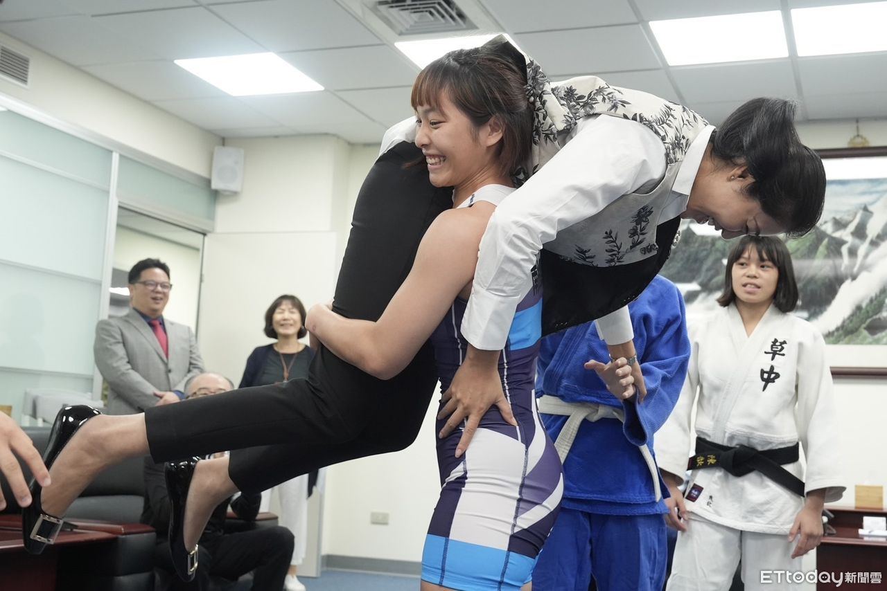 ▲南投縣長許淑華被角力女國手「塔庫魯(擒抱)」。(圖/南投縣政府提供,下同)
