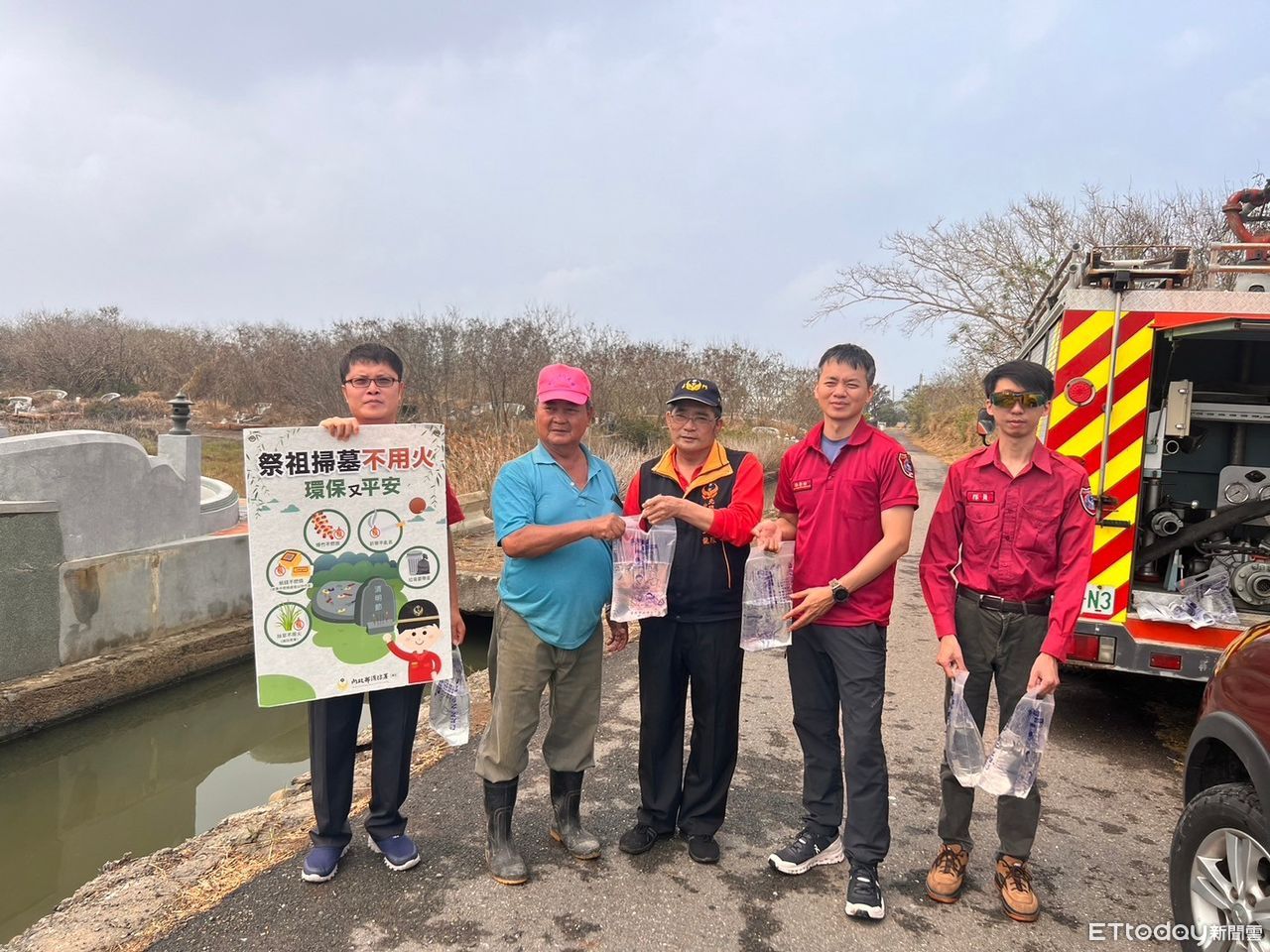 ▲台南市消防局提倡掃墓不用火,以提防明火或微小火源造成火勢燃燒,消防局於清明期間啟動多場墓地巡視防護勤務並實施防火宣導。(圖/記者林東良翻攝,下同)