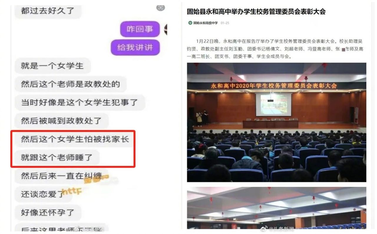 大陸有網友4月2日爆料,信陽市固始縣永和高中一張姓男教師在校期間,與一名女學生發生關係。網爆圖片顯示,這名張姓男老師事發時在永和高中政教處任職,而這名女學生因在學校犯事了,女生怕被叫家長,「就跟這個老師睡了。」