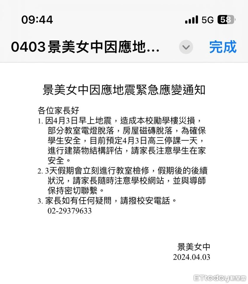 今(3日)上午7時58分東台灣發生規模7.2強震,且餘震不斷,各地頻頻傳出災情。台北市景美女中三年級所在校舍勵學樓因有鋼筋裸露、教室燈座掉落等的問題,校方經邀集教師會等討論,決定高三18個班今日停課,影響學生608位。