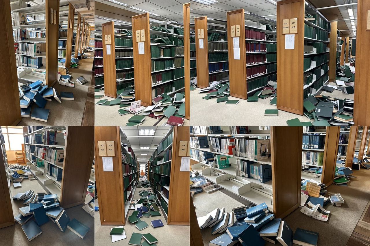 今日上午的7.2強震,除了花蓮地區嚴重災害外,全台各地也陸續傳來災損,國立陽明交通大學的浩然樓也受到地震影響,外牆發生磁磚掉落,樓內的圖書館藏書也因巨晃掉落滿地。