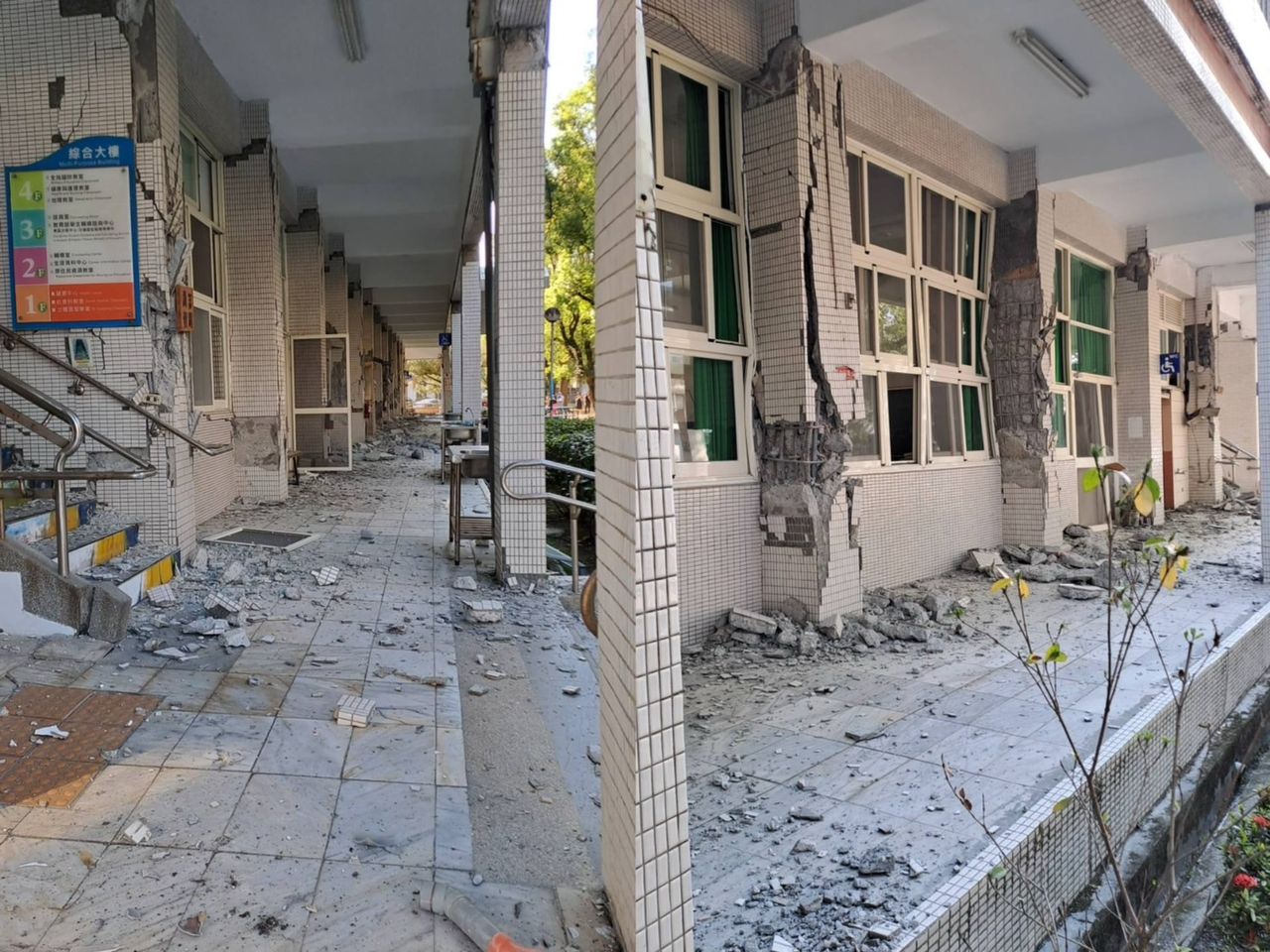 ▲花蓮7.2強震,導致花蓮女中建築發生磁磚剝落。(圖/翻攝自記者爆料網)