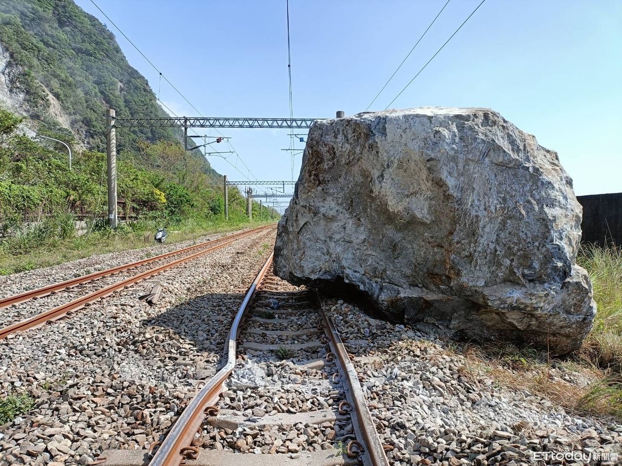 ▲花蓮強震讓巨大落石掉落台鐵軌道。(圖/讀者提供)