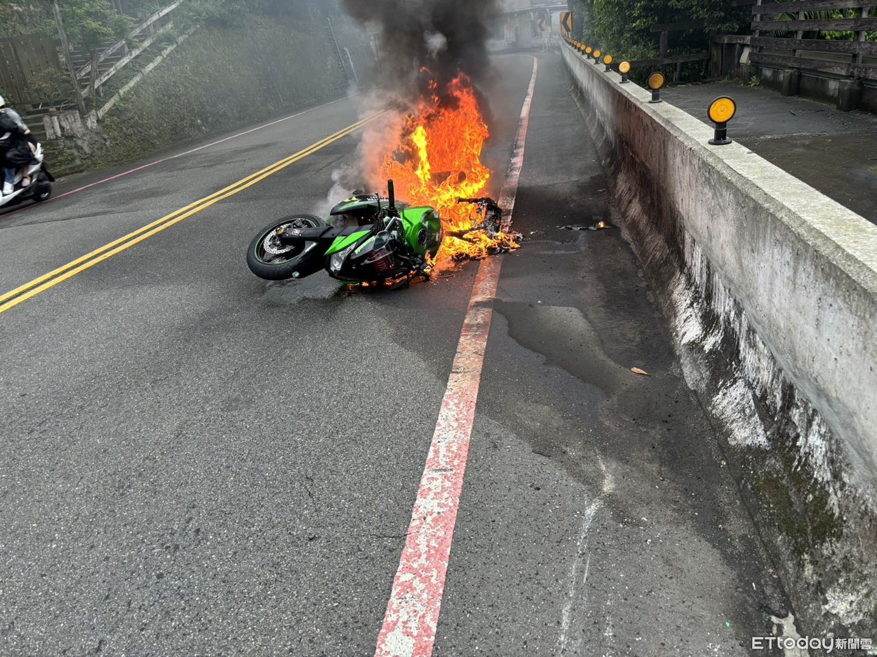 ▲▼ 重機騎士自摔,人車摔飛出去後,車輛瞬間起火燃燒 。(圖/記者郭世賢翻攝)