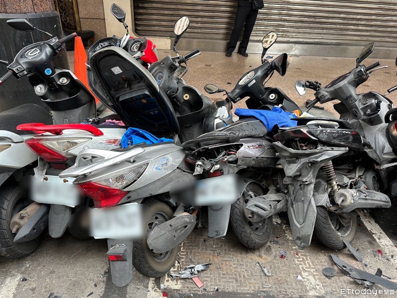 ▲新莊小客車失控撞倒21部機車後肇逃。(圖/記者陳以昇翻攝,下同)