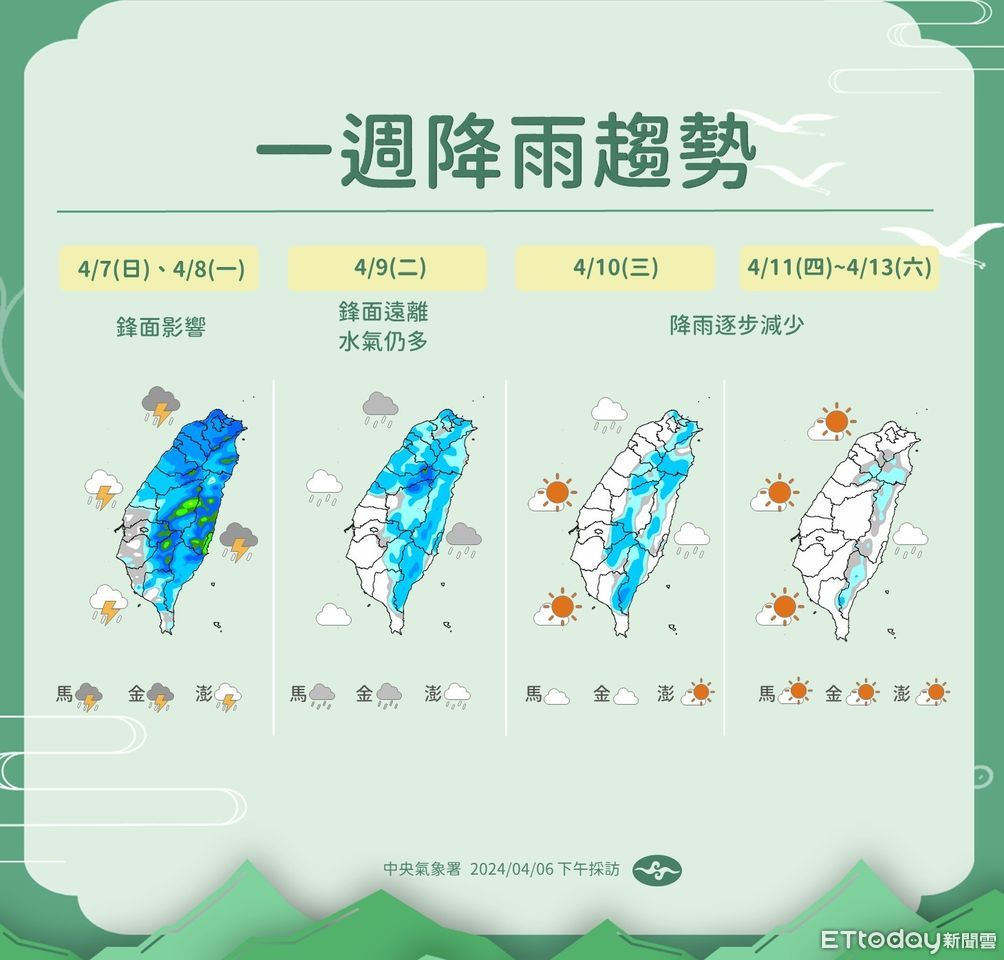 明後兩天防大雨!中央氣象署表示,明、後(7、8日)兩天受鋒面影響,各地都有降雨機率,中部以北、東半部及南部山區有局部短暫陣雨或雷雨,並可能伴隨瞬間大雨、雷擊、強陣風等較劇烈天氣,請民眾注意氣象署發布天氣特報。預計下周二(9日)鋒面遠離,雨勢才會趨緩。