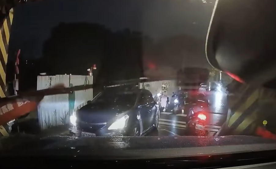 桃園中原大學附近4日晚間差點發生交通意外,一名汽車駕駛行經平交道時,要直行進入對向單行道,卻遇到違規逆向的汽車不斷逼近,正好又遇到平交道欄杆放下,急得駕駛趕緊按喇叭,逼迫對方後退,接著硬擠過已經放下的欄杆,才驚險逃過一劫。