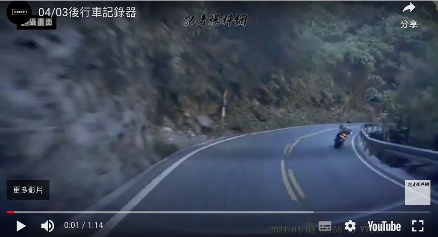 7.2花蓮地震當下,有駕駛在太魯閣遇到山崩,幸好在明隧道中躲過被土石掩沒的意外。不過行車紀錄器中有拍到一台黃牌重機騎士,許多網友關心該騎士的安全。不過後來當事車主透露,該名騎士是員警,當天就立刻返回崗位救災。