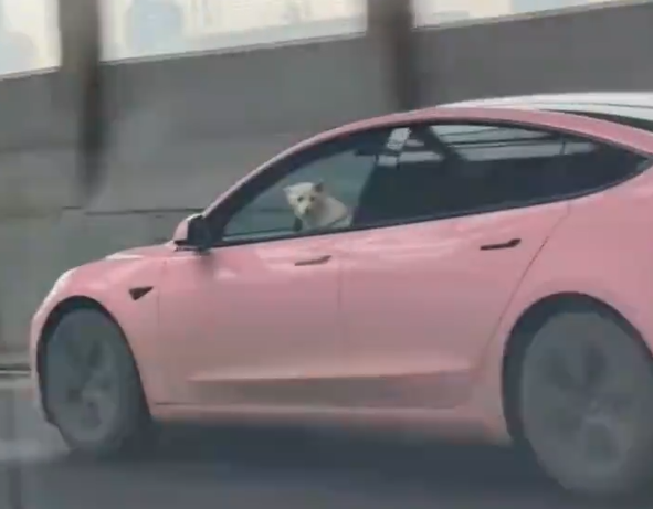 影片中,一輛粉色特斯拉在路上行駛,仔細看駕駛座竟坐著一隻白色的狗狗,頭還探出窗外四處張望。車主事後也表示,是開了自動駕駛功能,想讓狗狗「開車」。