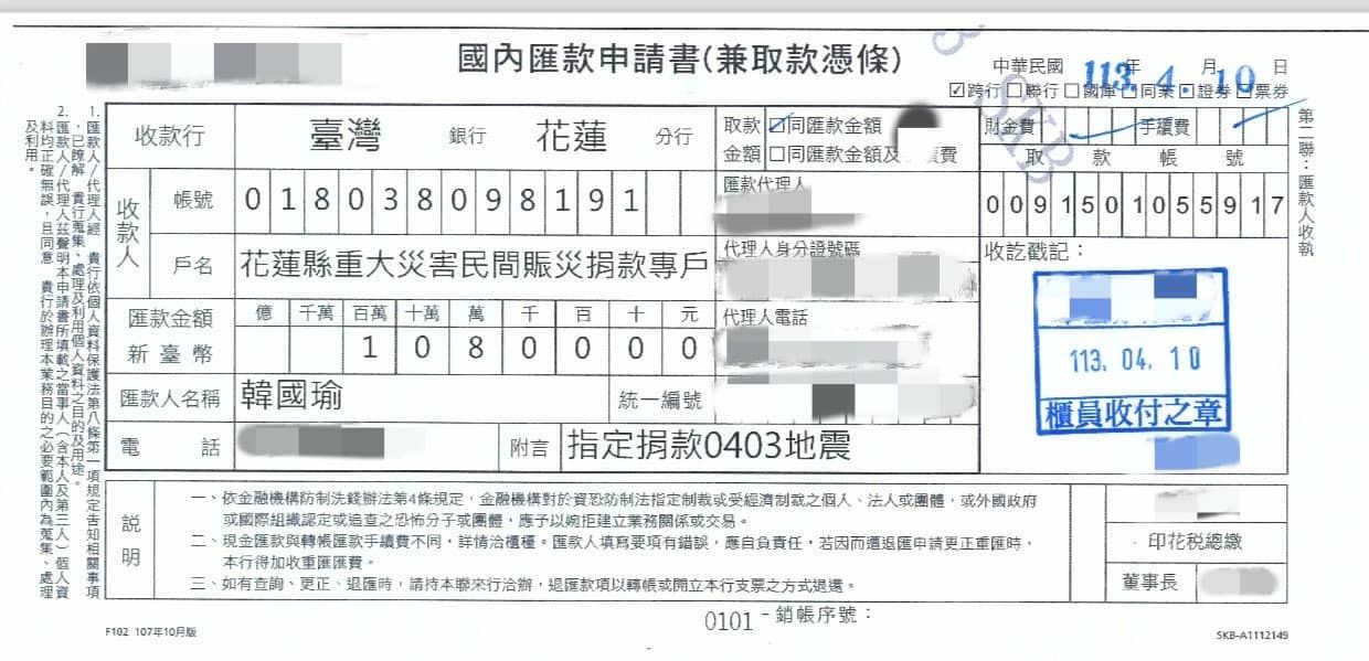 0403大地震災後重建還在進行,立法院長韓國瑜日前表示,將捐出就任立法院長以來至今之薪資所得,10日則亮出收據指已完成捐款,從照片中可看到,韓國瑜的匯款金額為108萬,捐款至「花蓮縣重大災害民間賑災捐款專戶」。