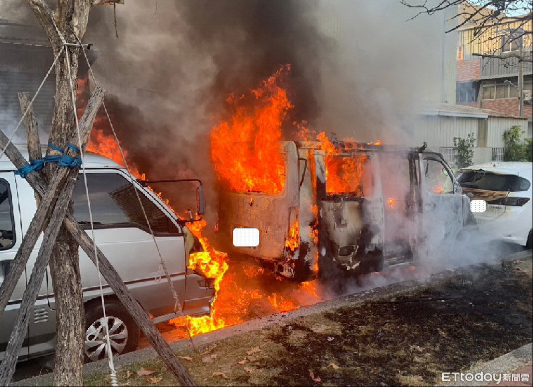 ▲台南市安南區公園旁道路發生一起小貨車火災,並波及停放於前後之2輛汽車,消防局調查發現,小貨車車主因露營需求而自行加裝太陽能板、逆流器及鋰電池模組等「鋰電池設備」發生火災。(圖/記者林東良翻攝,下同)