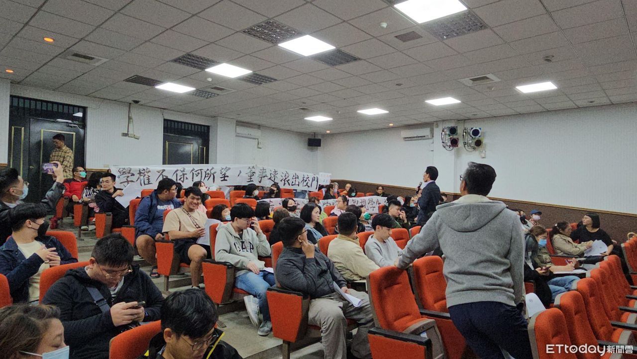 ▲大漢師生反對董事會停招停辦計畫,昨晚的說明會上還拉白布條抗議。(圖/高教工會提供)