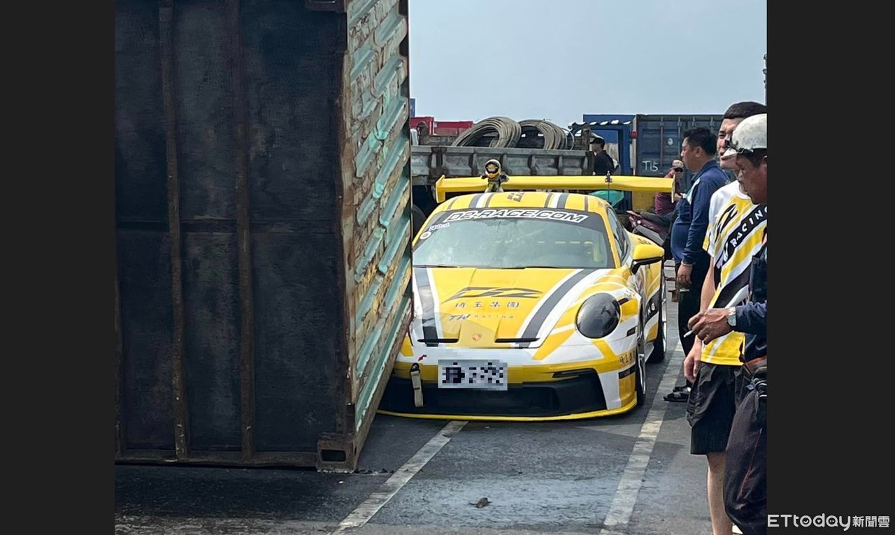 郭國信表示,疑似貨櫃拖吊油壓桿斷裂,結果貨櫃從天掉落,砸中路上的價值1500萬元的保時捷992 GT3,而掉落的貨櫃內還有一輛比賽備用車約200萬元的Audi TT。郭國信透露,因保時捷引擎在後方,所以車輛損壞情況不會太嚴重,而明天開始的比賽也一切正常。