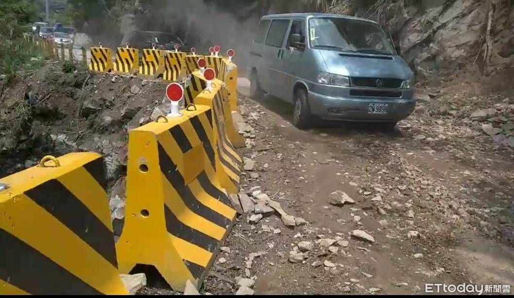 ▲▼凌晨連3震中橫便道無預警落石,中午放行車隊受阻返回,下午工務段派出管制人員監看放行。(圖/記者李陳信得翻攝,下同)