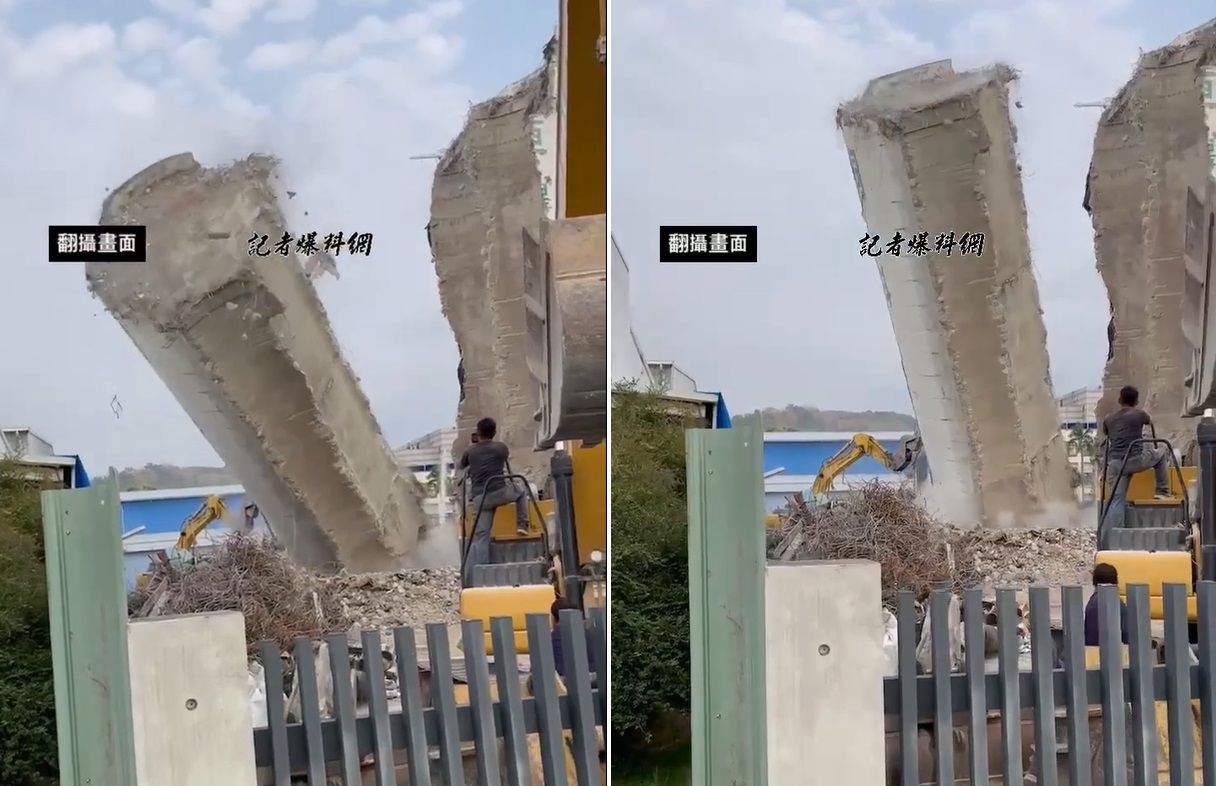 據了解,這起事故發生在今天下午4點30分,現場正進行草屯鎮農會飼料儲存槽拆除工程。根據畫面,只見飼料塔不明原因向一側倒塌,現場揚起大量沙塵,而拍攝者見狀也不斷驚呼「夭壽!害啊害啊(台語:慘了慘了)」,並連連後退。