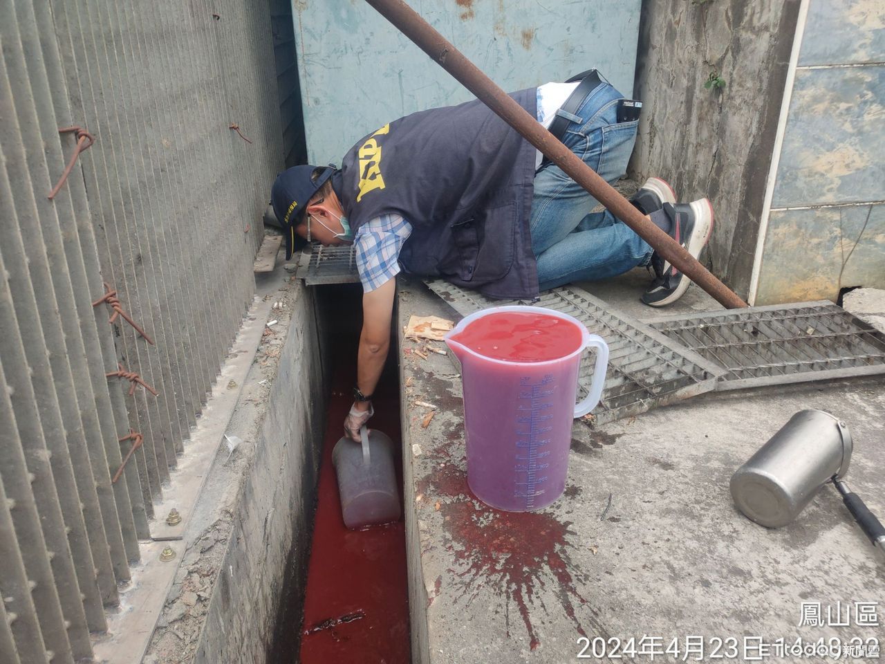 高雄市環保局今(23)日持續針對鳳山溪水污染管制區加強稽巡查,於鳳山區鳳仁路巷弄內側溝發現一股「血紅色廢水」排出。環保局人員循線往上游查察,查獲一家膠囊保健食品工廠,未妥善收集處理製程廢水就排放,依違反水污法第30條規定依法告發。