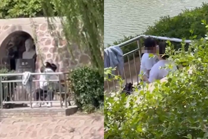 綜合陸媒報導,這起事件發生在河南省鄭州升達經貿管理學院,有人目擊一對小情侶在校內孟子雕像旁的長椅上演「觀音蓮座」跨坐激戰,從網路上曝光的畫面可以看到,少女直接跨坐在男生腿上,兩人瘋狂前後搖擺、深情擁吻。