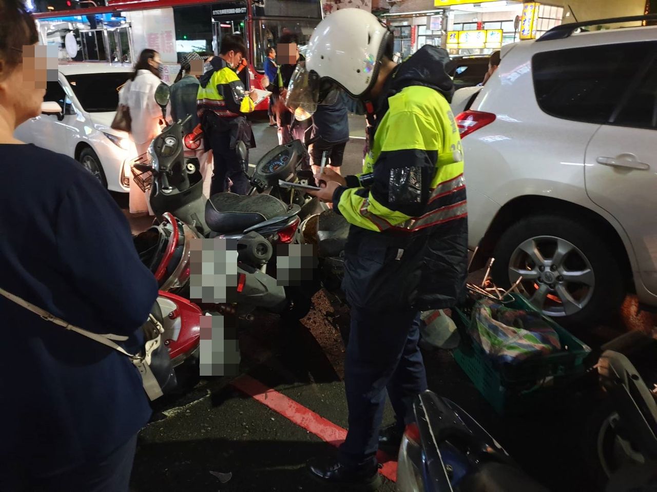 經過初步了解,肇事車輛疑似是為了閃避右側路旁的白色車輛,緊急偏左卻擦撞左側的自小客車,接著又失控撞上路邊一整排停放的7輛機車、1輛電動車。詳細車禍肇責歸屬,仍待進一步釐清。