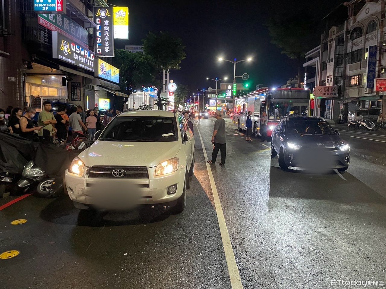 ▲高雄一名男子疑似為閃車,先撞擊內側車道小客車,再衝撞路邊7部機車及1部電動自行車。(圖/記者吳奕靖翻攝,下同)