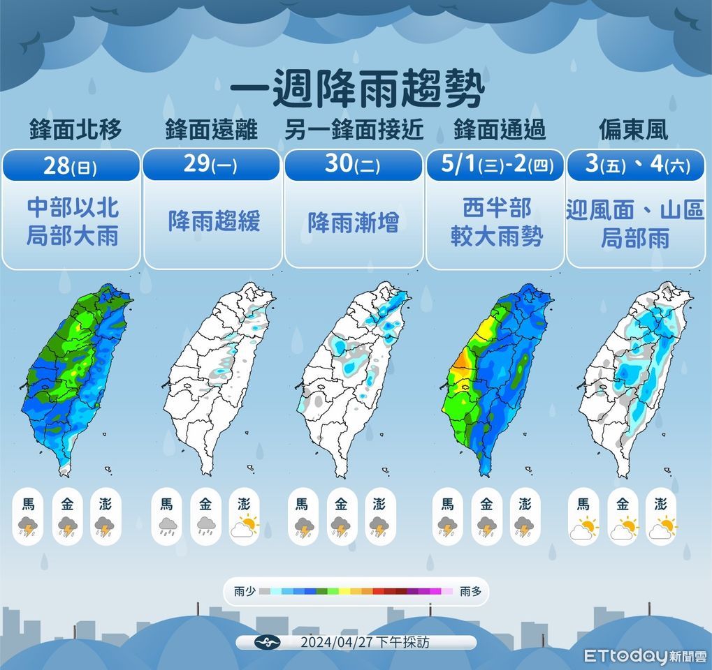 下周三、四(5/1、2)受鋒面及東北季風增強影響,天氣更不穩定,葉致均指出,全台都有降雨機率,其中西半部及東北部有短暫陣雨或雷雨,其他地區也有局部短暫陣雨或雷雨,西半部容易有短延時強降雨,並有局部較大雨勢發生機率,請民眾注意氣象局發布天氣特報。