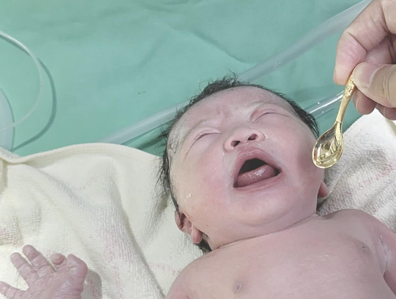 ▲爸爸拿出事先準備的金湯匙,放在剛出生的女嬰旁邊。(圖/翻攝蘇怡寧臉書)