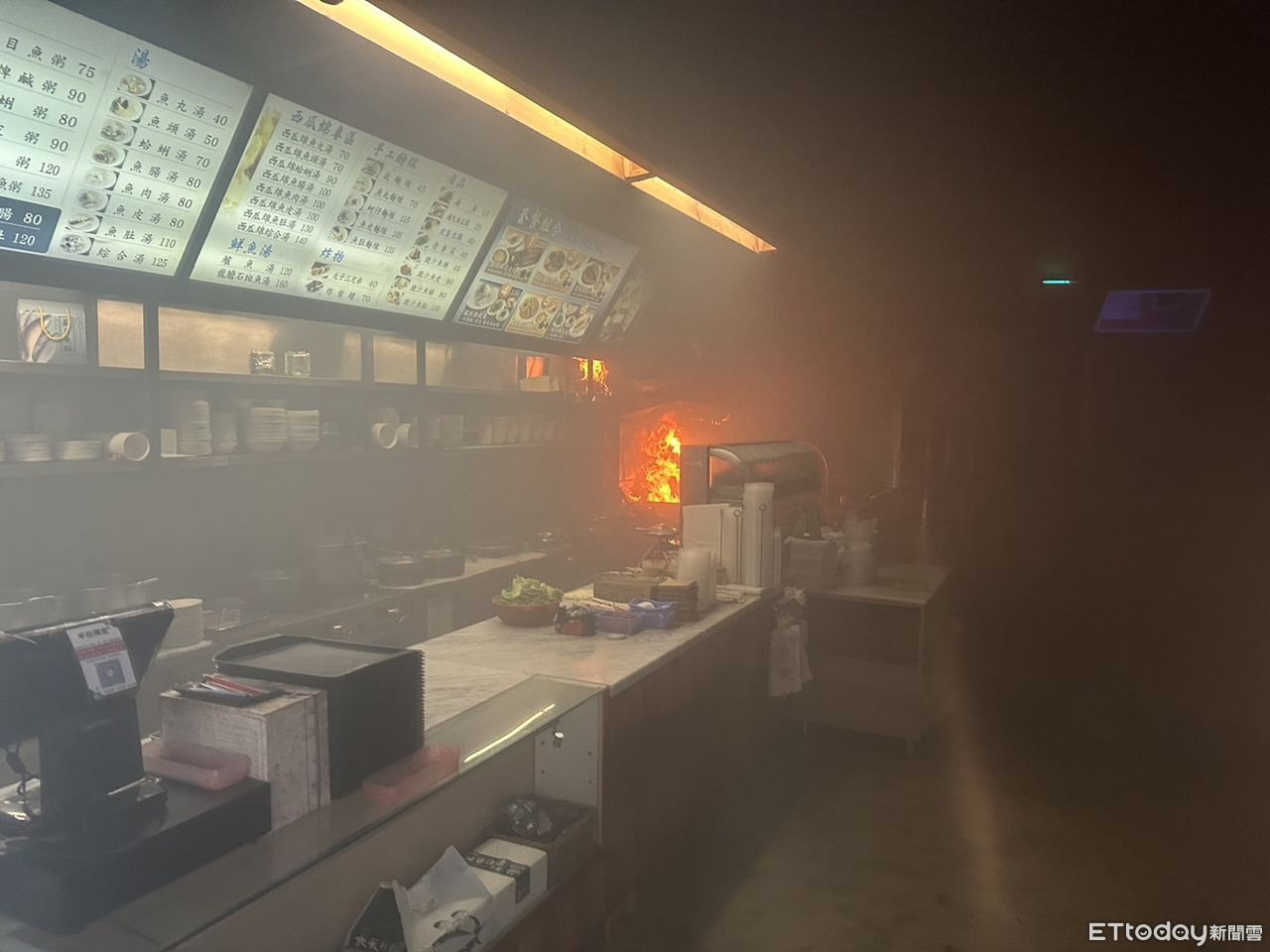 ▲台南市北區立賢路1段1家餐廳28日上午驚傳發生火災,消防人員射水搶救。(圖/民眾提供,下同)