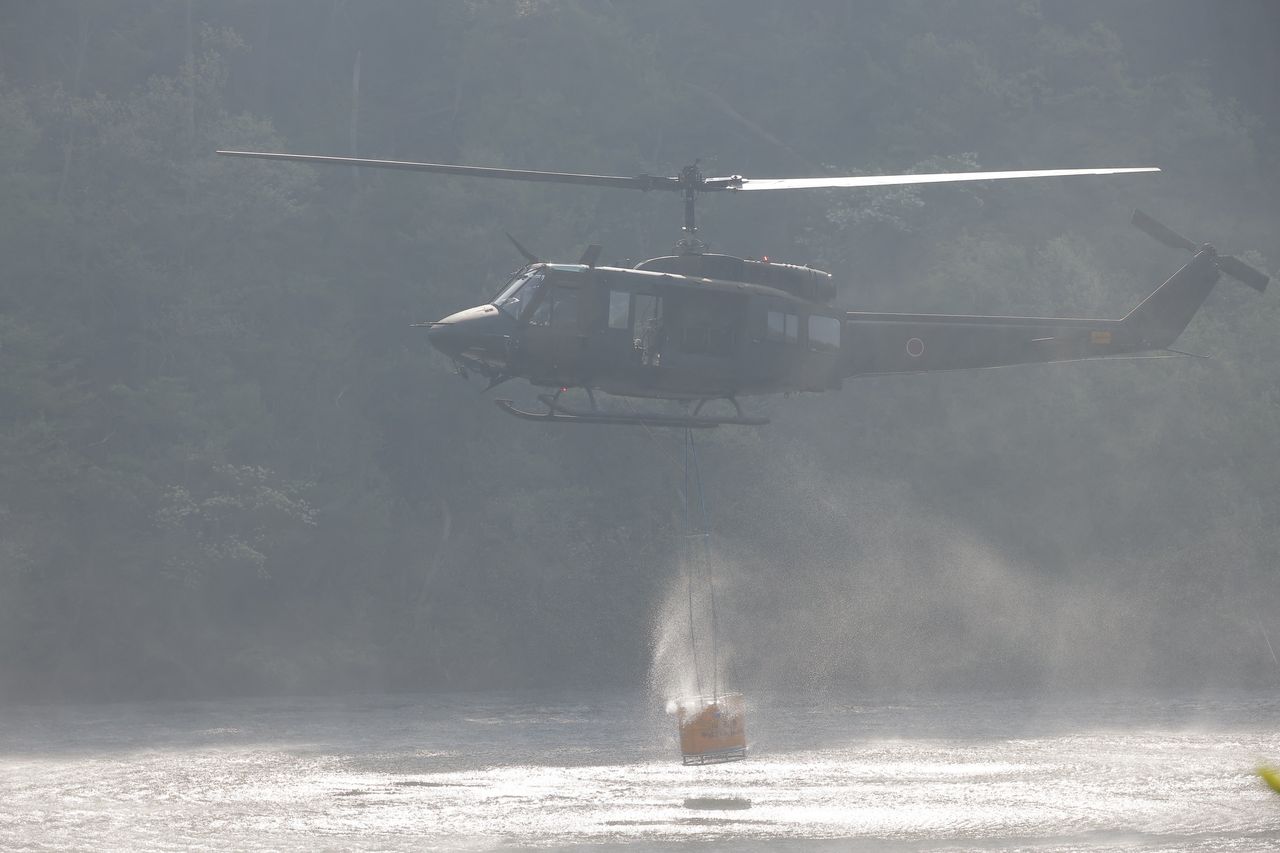 ▲山形縣、宮城縣、福島縣的3架防災直升機,以及陸上自衛隊的2架直升機,共5架直升機正在進行滅火作業。(圖/翻攝自X)