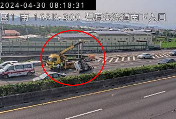 ▲現場畫面。(圖/翻攝高公局網站)記者陳俊宏/綜合報導高公局表示,今天8時9分,國道1號北向168.3K、豐原交流道南下入口路段,發生1輛自小客車翻車事故占中線車道,回堵1k,請用路人小心行駛。
