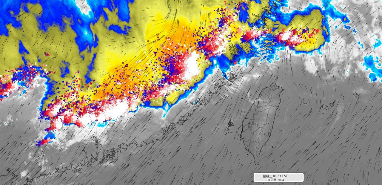 梅雨季首波鋒面即將抵達,氣象專家彭啟明表示,中國華南有一道長達1千公里閃電列車,今天(30日)深夜到明天周三(5月1日)接近台灣,明天鋒面通過,全台降雨機會增加,將有局部大雨。
