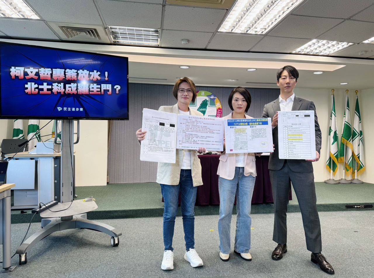 民進黨發言人吳崢、台北市議員簡舒培、林延鳳今天上午舉行「柯文哲專簽放水!北士科成羅生門?」記者會。