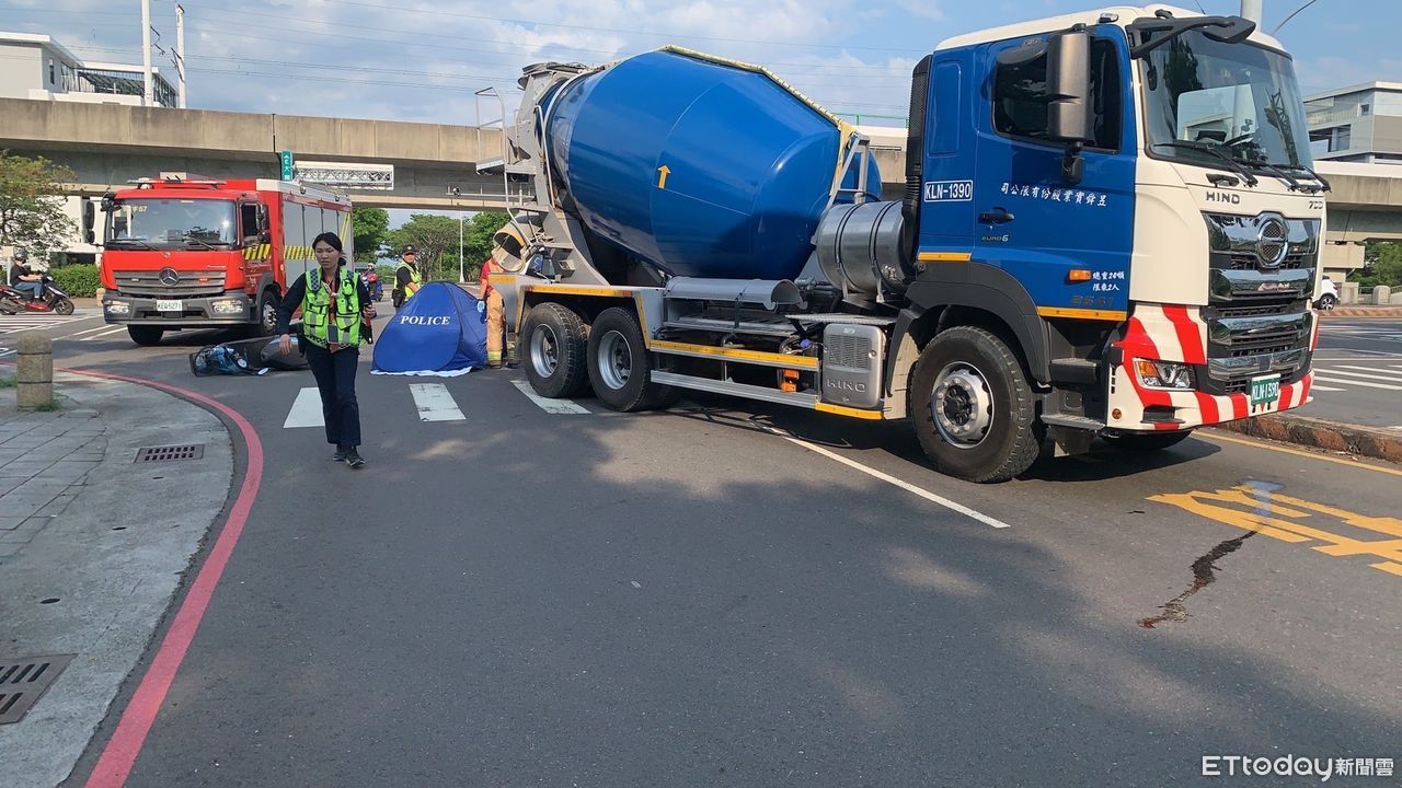 ▲台南市新市南科園區30日下午發生一起車禍命案,59歲女子騎機車在環東路一段跟大業一路交叉路口,疑遭水泥車追撞,女子人車倒地當場死亡。(圖/民眾提供,下同)