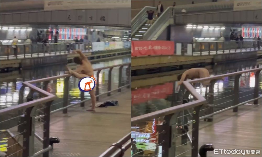 從畫面中可見,染著金棕色頭髮的男子已經脫光,在步道護欄邊拉筋,毫不在意抬腿時「大露鳥」,引來路人圍觀,不少人還拿出手機拍攝。接著,金髮男就在眾人的注目禮下,跨過扶手站到河邊,抬了好幾下腿後,便在一陣歡呼、口哨聲中跳進河裡。隨後,對面也跟著跳下一人,不過似乎並非全裸。