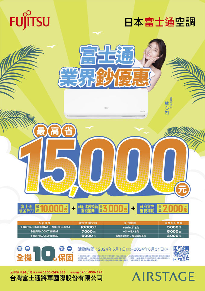 電價漲、物價漲、什麼都漲!萬物齊漲時代,日本富士通空調陪您省錢大作戰,即日起推出「業界鈔優惠」活動,政府貨物稅補助*1與政府汰舊換新節能補助*2,再加上富士通現金折扣*3,最高省15,000元,就是要讓您省錢鈔有感!