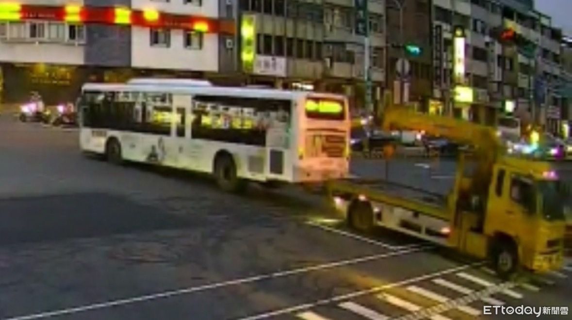 ▲台中一輛公車日前故障在下班車流中,救援工程車到場後,直接開到他後面推走它。(圖/記者許權毅翻攝)