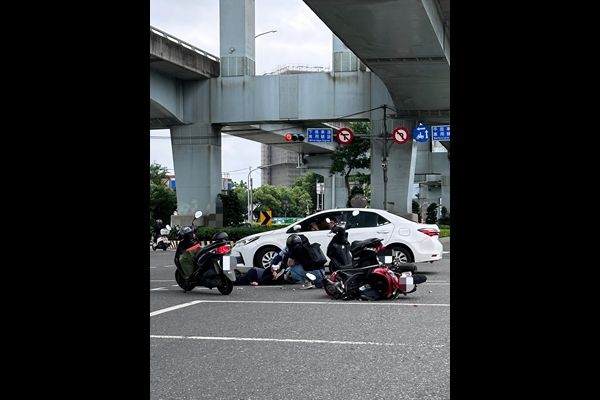 新北市泰山區新北大道和泰林路口2日下午4時24分發生一起車禍!一名27歲蕭姓女騎士搶黃燈時不慎自摔,當場人車倒地,一度倒在地上一動也不動,其他機車騎士見狀趕緊上前查看,並報警處理。警方獲報到場,隨即將受有牙齒斷裂、臉部血腫、四肢擦挫傷等傷勢的女騎士送醫急救。