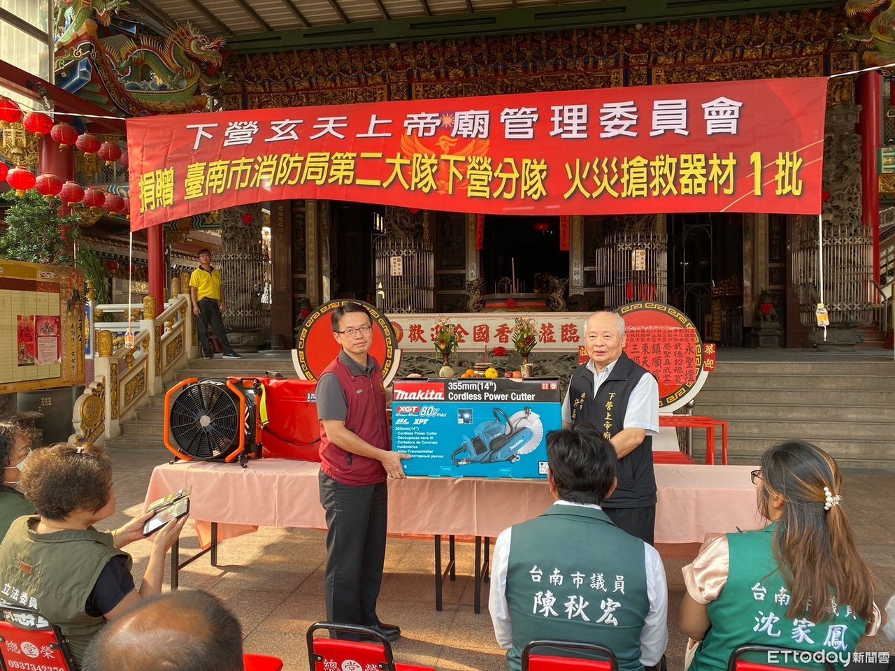 台南市消防局2日於下營玄天上帝廟廟埕前,舉辦捐贈下營消防分隊救災器材一批儀式,由第二救災救護大隊王騰毅大隊長代表受贈並頒發感謝狀,以感謝下營上帝廟管理委員會的善行善舉。