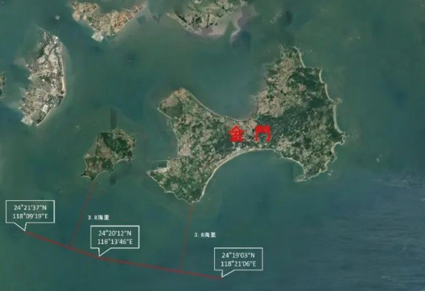 這次搭配一張海警艦艇編隊執法巡查示意圖,根據刻意用紅線標示巡航路線,不但距離大金門、小金門只有3.8海里(約7.0376公里)。