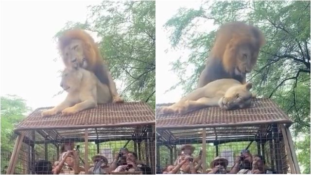 影片中,雄獅爬到車頂的母獅身上,立刻開始交配,只見牠試圖咬住對方的脖子與耳朵,還發出低聲吼叫,激烈程度讓整輛車都在狂晃,但在完事之後,母獅立刻往旁邊倒下,看起來相當疲憊。