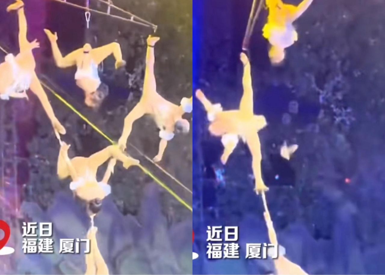 據《時間視頻》報導,近日,一名網友指出,福建廈門靈玲國際馬戲團的3名特技演員表演時,從高空墜落,其中1人死亡,相關影片引起熱議。