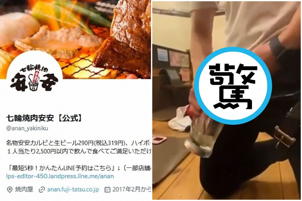據日本《Sponichi Annex》報導,這兩日有段影片被日本網友瘋傳,內容可見有一群男子到「七輪燒肉 安安」新宿店用餐,但這群男子不僅在店內大聲喧嘩,還有男子直接當場脫褲露下體,隨後更對準啤酒杯直接放尿。影片也可見,這些男子除了放尿,還有猥褻動作。