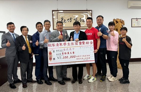 桃園市不動產開發商業同業公會日前捐贈南崁高中10萬元,作為球隊清寒學生的住宿補助,使學生能安心就學,專心參與訓練。南崁高中校長陳家祥3日感謝公會的慷慨捐款給清寒學生的住宿費,確保他們能夠不受經濟困境的影響,專心投入學業與運動訓練。