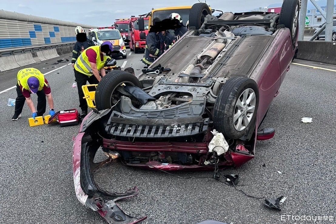 ▲國2大湳路段車禍,轎車翻覆釀1傷。(圖/記者沈繼昌翻攝,下同)
