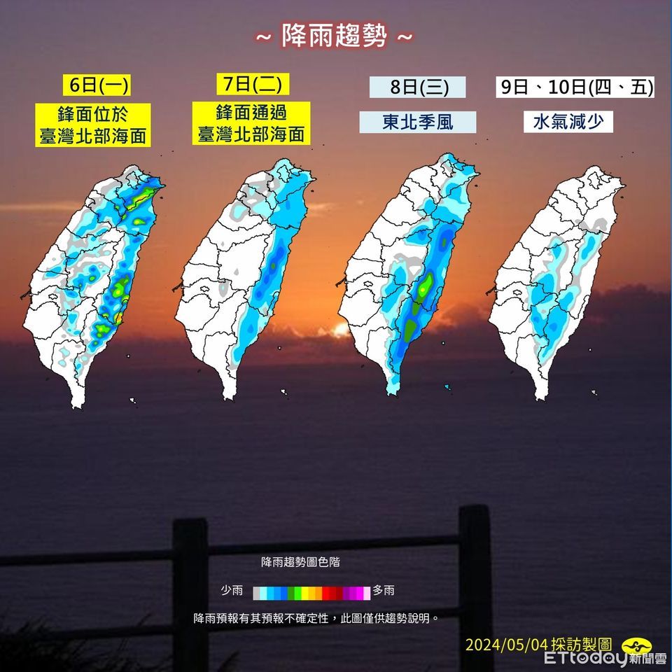 中央氣象署表示,明(5日)隨鋒面靠近,天氣轉趨不穩定,西半部與花東有局部短暫陣雨或雷雨,其他地區為多雲,午後有局部短暫雷陣雨,各地要留意有局部較大雨勢,下周一鋒面通過北部海面、下周二則因華南雲系東移,水氣仍稍多,預計下周三、四隨東北季風稍增強,北台灣略微轉涼,東北部低溫下探19度,水氣也逐步減少,下周五起將恢復為穩定天氣型態。