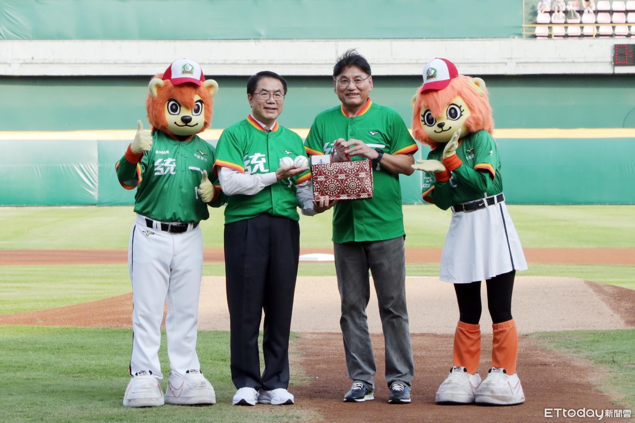 ▲2024統一獅復古季主題月首場週末賽事4日於台南市立棒球場登場,市長黃偉哲準備伴手禮及台南400授權商品鈦心杯贈予謝長亨,隨後由投手謝長亨投球,黃偉哲市長打擊揭開賽事。(圖/記者林東良翻攝,下同)