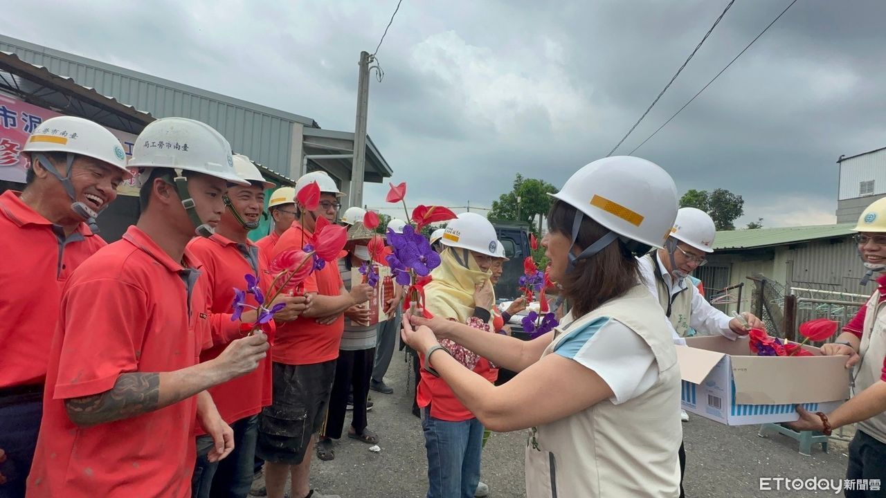 台南市長夫人劉育菁,5日代表黃偉哲市長準備大西瓜到麻豆案場慰勞台南修繕志工,更準備火鶴花束送給志工,祝福大家母親節快樂,大台南總工會陳美靜副理事長、鍾慧琴里長也準備飲品慰勞志工。